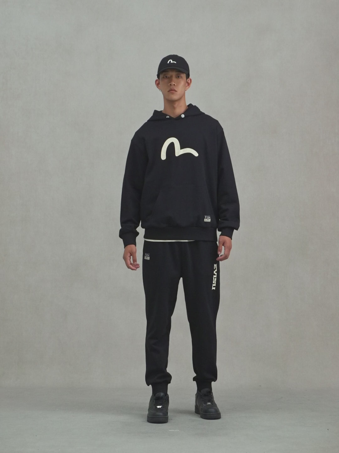 このスウェットパンツは鶴の恩返しをテーマに、知恵の輪、鶴、山を大黒プリントに取り入れ、鮮やかな色彩と独特なデザインを表現。前面の商標刺繍が、ブランドの控えめなラグジュアリーなスタイルを強調。